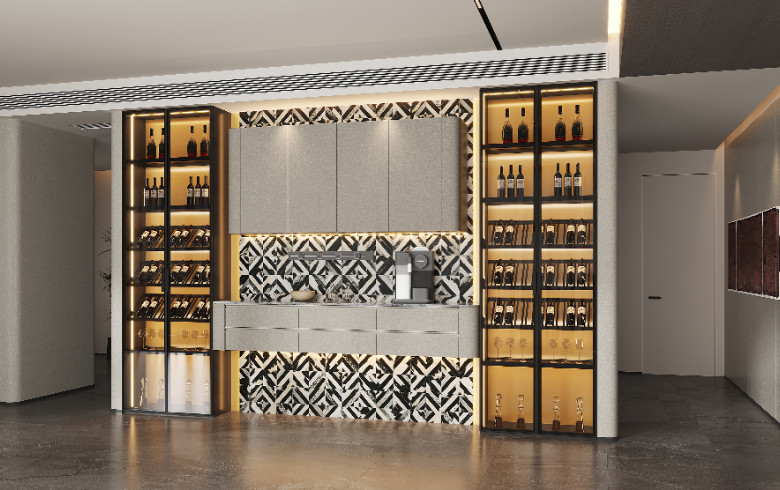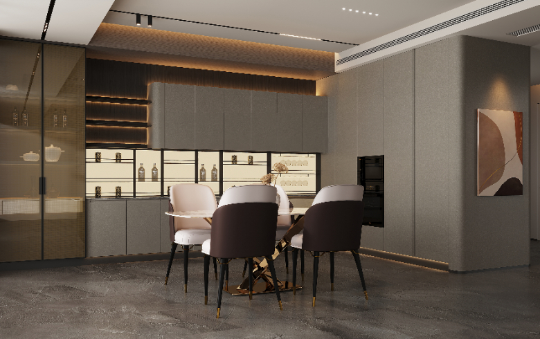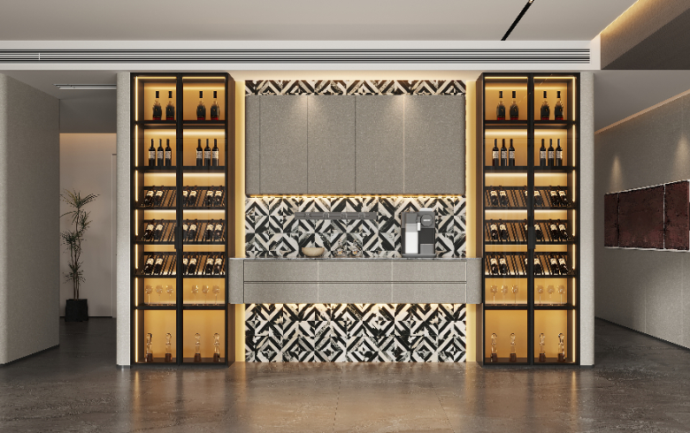 一字型餐酒柜,左右对称,吊柜+中部镂空区,藏酒区与收纳置物区兼得,3D打印装饰画背板融入隐形灯带,调和视觉,打造业主宅家社交场。