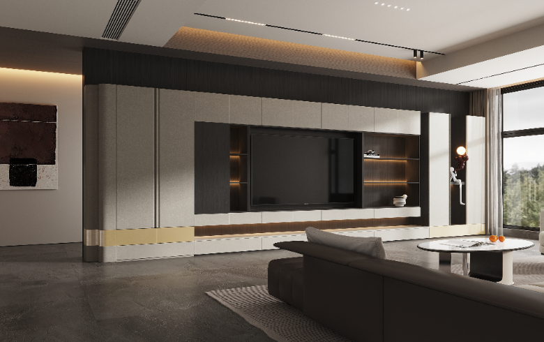 一字型满墙电视柜,满足收纳与展示,视觉上更有连贯性。
