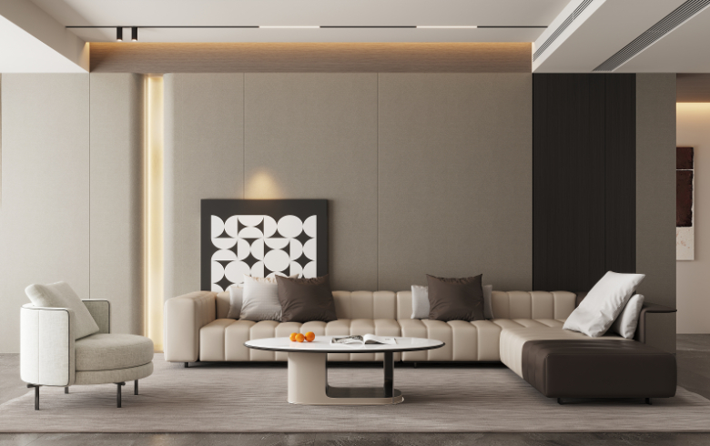 撞色沙发&轻量茶几,坐卧皆可,精致舒适,是 COCO治愈疲惫的“躺平”宝地。