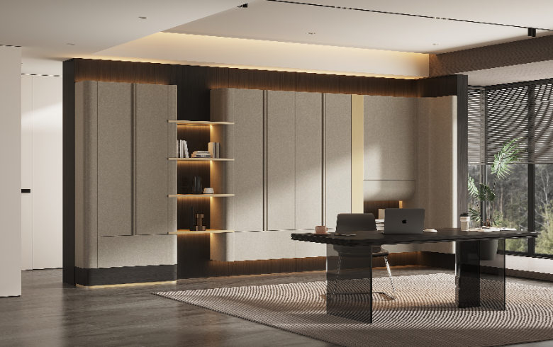 一侧设计成悬浮书柜,轻盈时尚,打破整墙书柜的厚重压抑感,让学习工作更轻松有趣。