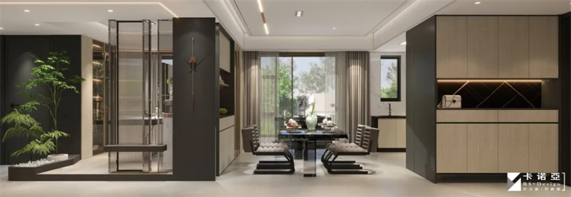 靠近餐桌的地方设置了餐酒柜,色彩与全屋呼应,茶色玻璃柜门通透可见,可以收藏香槟与红酒、杯具,觥筹交错,微醺生活,是E人聚会轰趴的好地方。