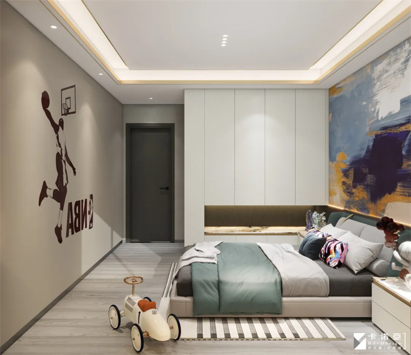 沿墙边进行空间布局,打造学习区、休闲区和收纳区,让男孩拥有自己的私享天地。