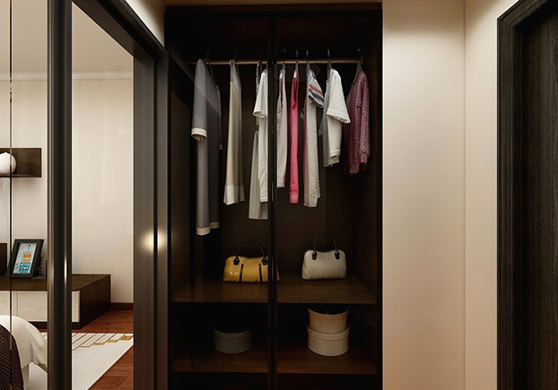 主卧旁边做了一个入墙衣柜,将异形空间利用起来,可以放一些平常利用率高的衣物和包包,上班急着出门直接从这儿拿,方便又快捷。