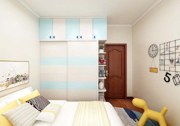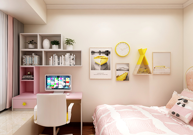 小朋友的房间比较明亮,童趣十足,水天蓝和公主粉的设计再搭配明亮黄,瞬间轻快明亮,功课区和休闲区的设计,书桌功课做完立马可以在休闲区玩耍,一房多用,小朋友们表示很喜欢自己的房间。