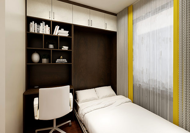 主卧空间的设计考虑到女主人平常喜欢阅读,所以有在墙上做一个储藏书柜,装饰柜跟书桌的搭配,既是化妆台又是小书桌,小户型房间的设计真是一平米都不浪费。