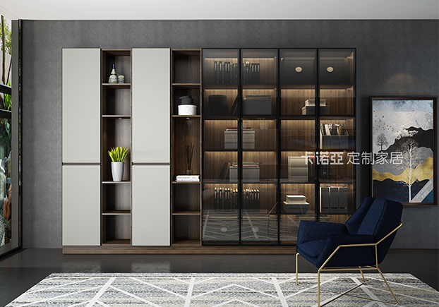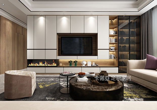 电视柜半开放设计,黑框金属玻璃门的搭配使得整个空间更富有立体感。