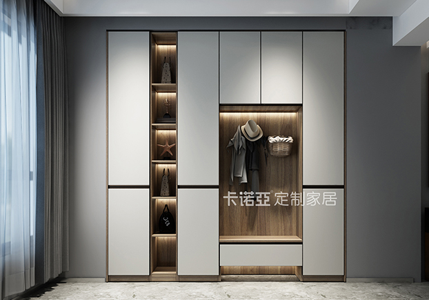 嵌入式玄关柜,下面是用木质板做成的换鞋凳,上面再设计挂钩,这样实用功能和装饰作用都大大增强。