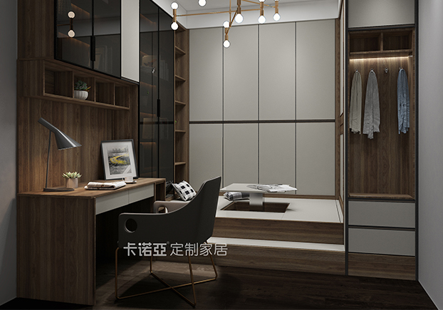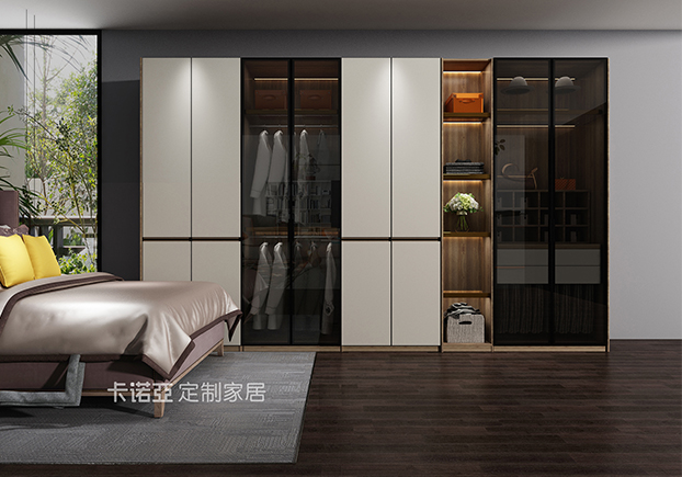 卧室比较沉稳大气,玻璃门半开放式衣柜黑白相间,空间空旷开放,有点极简风。
