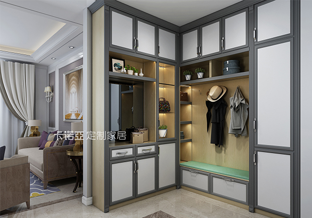 为了防止空间不足,设计师做了到顶处理,开放空间用于放置伞、手表之类的出门必备物品。