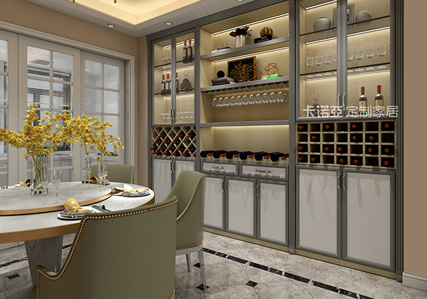 餐厅则选用了欧式风格明显的餐椅及现代风格明显的餐桌,在复杂与简约上取得了微妙的平衡。背景墙则做了整面的餐边柜,用于放置多余的餐具厨具、干货杂货、酒杯、饰品等,为91视频福利网站空间收纳减压。