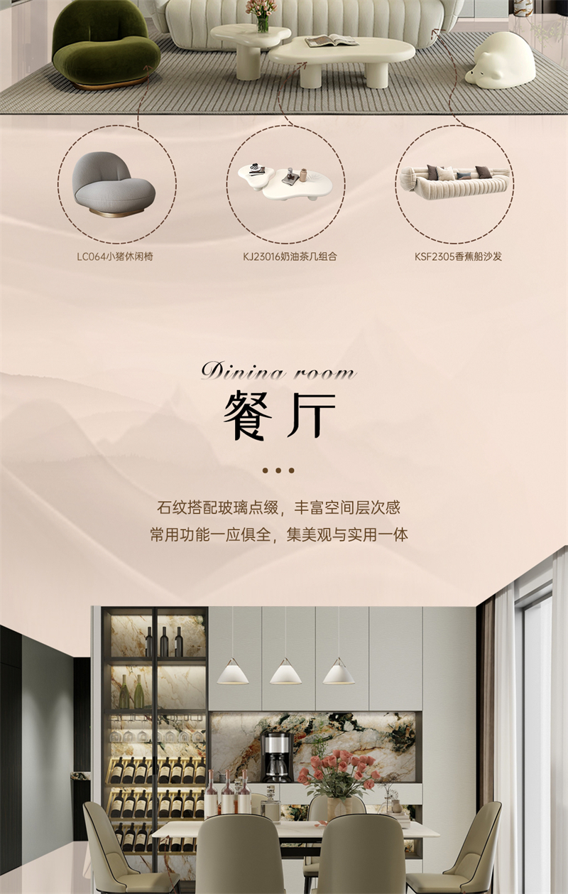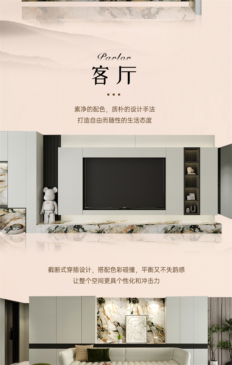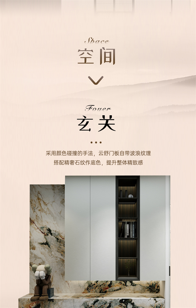 借助云水纹的元素,通过流动的线条,波动的纹理和现代的设计手法,打造舒适、放松、愉悦的家居氛围。