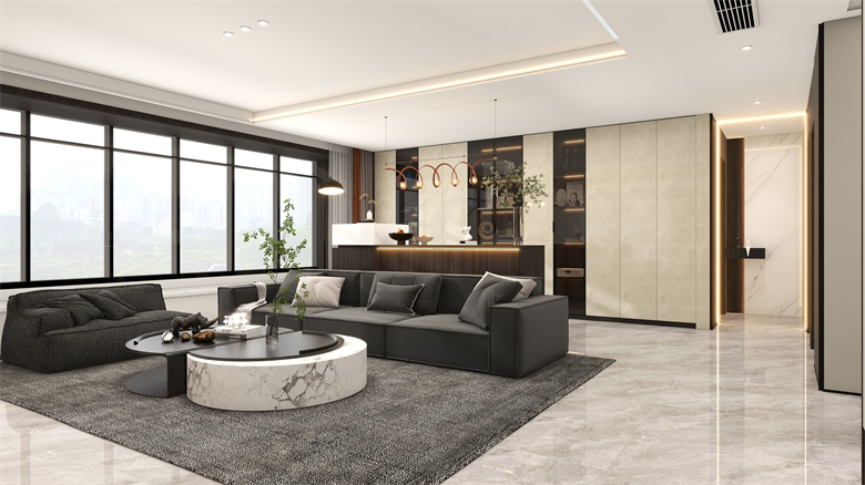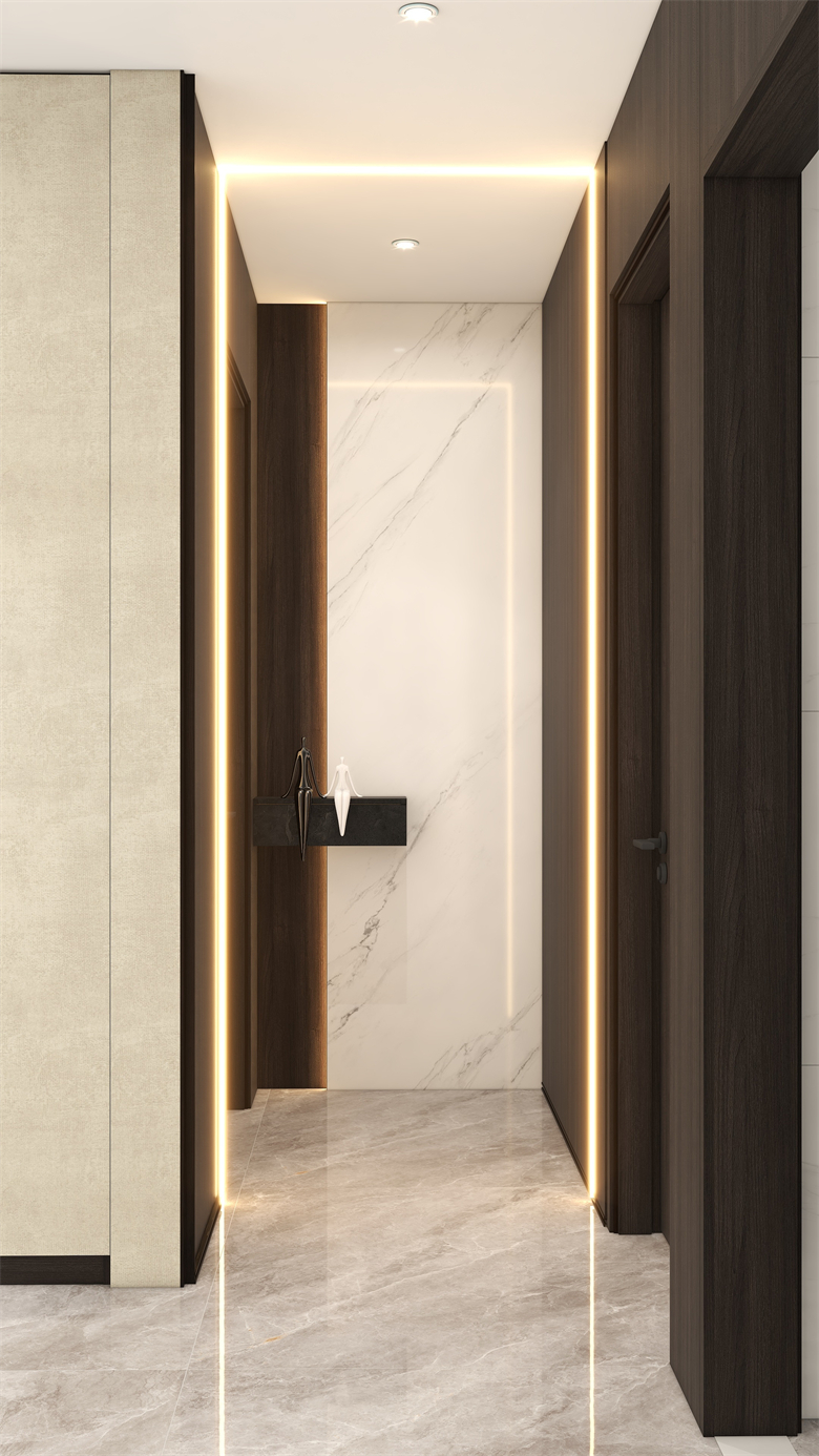整体空间以现代轻奢风格的设计基调为主,布置上简约时尚的家具,营造温馨的家庭氛围;利落的线条搭配舒适质感的软装;开阔的空间为整个设计带来自由闲适;迎合业主家庭成员的需求,将空间最大利用设计化,暖色调的灯光布置,整体温暖舒适;各种材料相互协调,带来时尚的氛围。