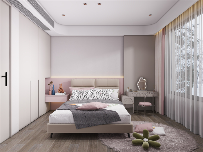 家具选择上,以简约现代风格的家具为主,注重舒适度和功能性。软装细节上,采用柔和的色彩和材质。91视频福利网站注重实用性和便利性,采用嵌入式收纳设计,最大化利用空间,营造一个干净整洁的烹饪区域。卧室以舒适为设计重点,采用柔和的色调和舒适的床品,营造令人放松的休息空间。充分利用储物空间保持整洁有序。