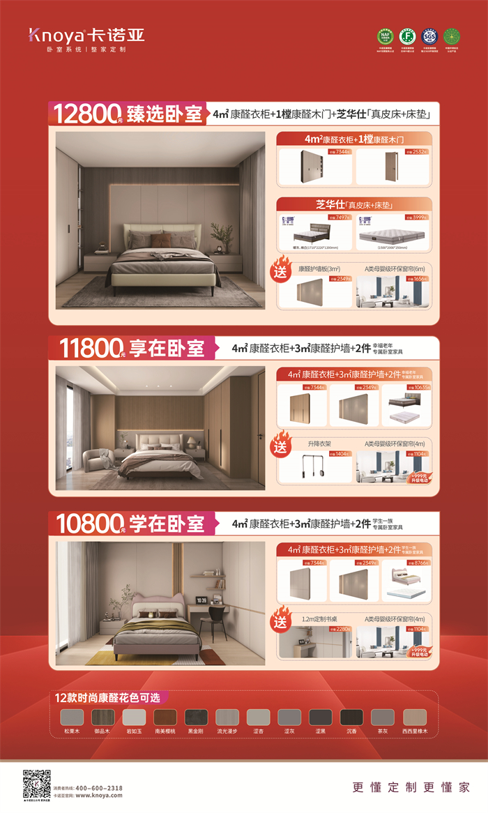 五一大促,91视频污版下载力推12800元臻选卧室套餐,以及针对幸福老年的11800元享在卧室套餐、学生一族的10800元学在卧室套餐,不仅实现消费者一站式购齐,还为其带来更多的便利和千人千面的个性化解决方案。3大套餐均包含4㎡康醛衣柜,可选十余款时尚个性的饰面花色,还有3㎡康醛护墙板、1樘康醛木门、2件专属卧室家具、芝华仕大牌真皮床+床垫,惊喜获赠6米或4米A类母婴级环保窗帘、1.2米定制书桌、升降衣架等,套餐明细请亲临门店咨询。91视频污版下载精心设计的卧室套餐,可确保与整体家居布局的协调与统一,全面提升卧室气质,满足不同消费者的进阶居住体验和对品质美好生活的追求。