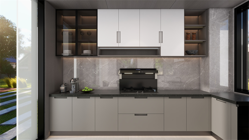 吊柜和地柜分别搭配“晨露白”和“薄暮灰”,中间辅以大理石纹,暖意徜徉,烟火气扑面而来。整体视觉干净大气,玻璃门点缀,增强视觉通透感与层次感。