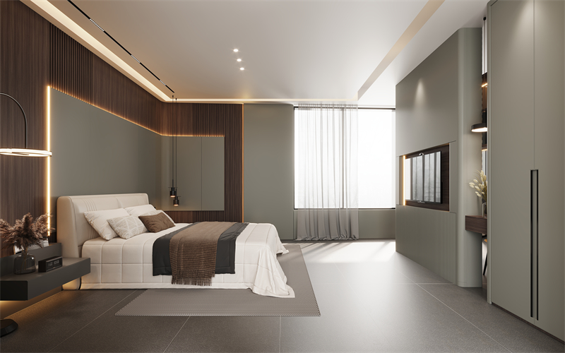 【睡眠区】床头护墙板,一前一后采用温暖的深木色搭配温婉的“薄暮灰”,护墙板转角采用圆弧过渡,优雅流畅的曲线轮廓,彰显空间的圆润感、高级感和立体感。柔软舒适的寝具,让每个追梦人沉浸美梦之中。