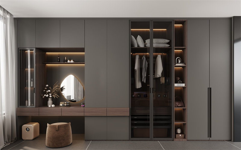【收纳区】卧室收纳区设置成一个步入式衣帽间,靠墙定制一整排衣柜+梳妆台,让每一次的换装都赏心悦目,为白领精英的美好形象加分,打造高颜值的精致生活。