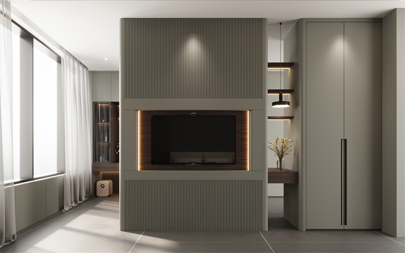电视背景墙采用简洁流畅的线条,与简约的“晨露白”色彩完美融合,弧形转角过渡,展现一种简约而不失精致的柔美感。电视柜采用高端定制精湛工艺,包括黑科技的悬浮设计+柜中柜设计+拉米诺/无孔工艺,打破传统墙面的厚重感,赋予空间轻盈灵动的观感。