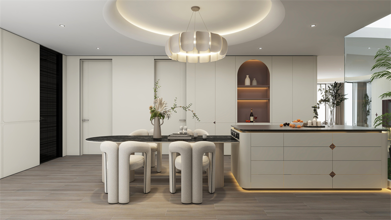 开放式餐厅布局,岛台+餐桌一体化设计,富有造型的餐椅搭配,中和了空间的单一感。简约清爽的“白芷”配色,随处可见的三角几何门型点缀,赋予用餐时光,更多有趣的生活情调,让家人纵享美味佳肴。