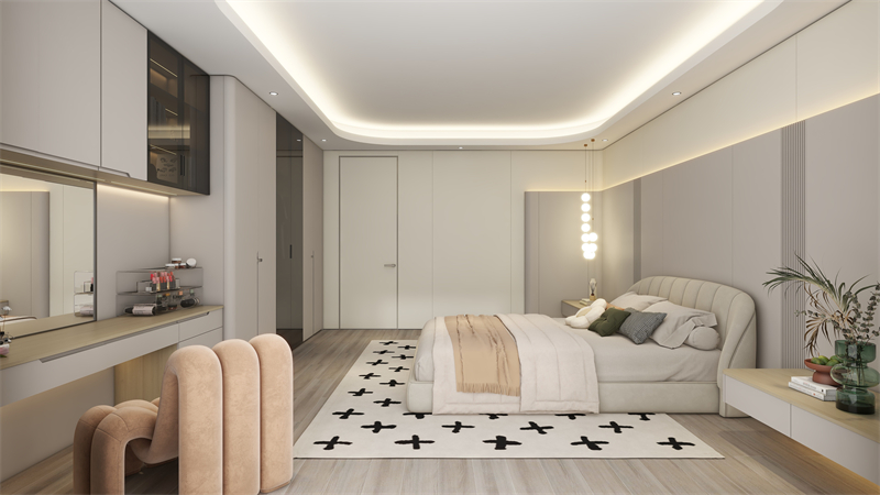打破传统墙面直线条的常规设计,圆弧护墙板以更柔和的曲线语言,勾勒卧室的柔美与静谧,搭配奶油色系软装,简单耐看,营造深度睡眠的舒适环境。