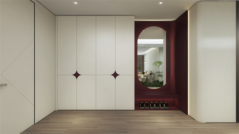 圆弧形的转折处理,使得玄关区域在视觉上更加流畅与连贯,宛如自然延伸出的一个优雅弧度,引领家人顺畅步入家中。下方保留开放式常换鞋区,简洁实用;圆弧拼接门型搭配“白芷”、“红鸾”撞色点缀,打破传统色彩界限,赋予空间柔和而深邃的视觉层次。