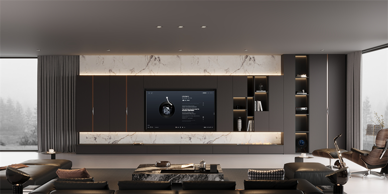 ·材质对话:直纹肌理板材与涩黑柜体形成深浅对比,数码打印出来的纹理如大理石般通透,铝木玻璃柜将金属坚韧与木材温润完美结合。