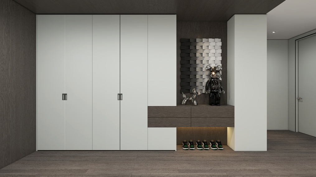 玄关作为归家的第一道风景,以极简线条勾勒出品质生活的轮廓。穿插式的设计营造悬浮感,创造了独特的视觉效果。罗亚特有的奶咖色调在门厅空间得到完美呈现,温暖的色彩搭配亲肤材质,让每一次归家都成为感官享受。