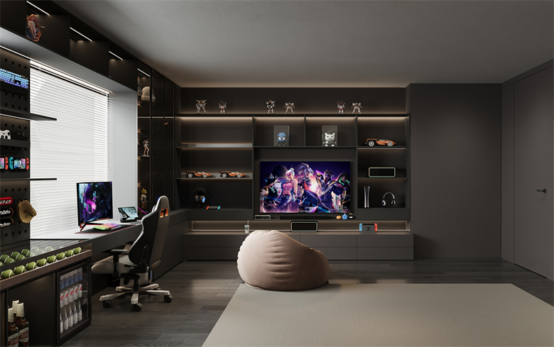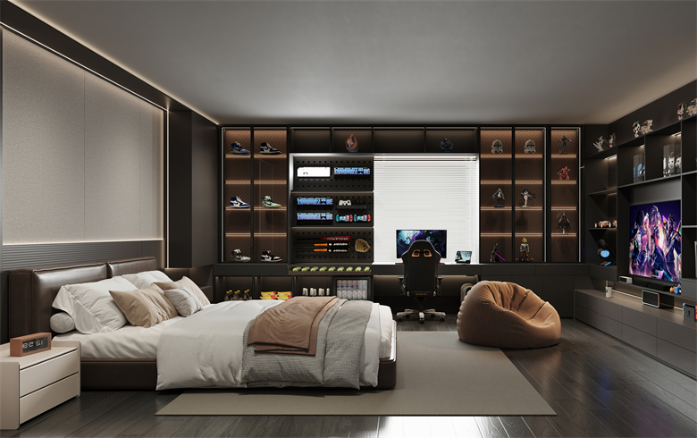 就连卧室也被赋予 "超级玩家" 的属性 —— 睡眠区的静谧、收纳区的有序、电竞区的热血、娱乐区的松弛,四大功能分区精准匹配新贵们的多元需求。睡眠区以降噪墙板与恒温床垫构建静谧结界,卸下白日疲惫时,连呼吸都变得轻盈;收纳区的隐藏式柜体与模块化格架,让潮玩手办、电竞装备各得其所,视觉上的整洁感本身就是种治愈。