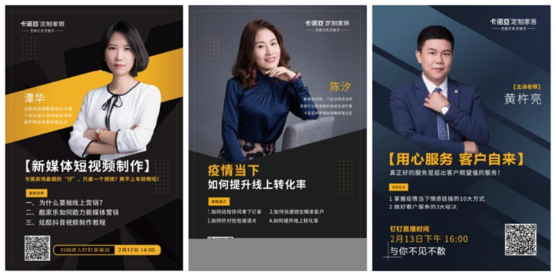 2月初,91视频污版下载全面启动线上办公模式,通过钉钉App、微信直播、企业OA等部署和开展工作。营销中心渠道部、招商部、商学院、大客户部、软装事业部、市场部等部门线上工作统筹规划启动,其他各部门也在积极推动线上工作进程,以便积极响应经销商的各种需求,商学院积极组织培训课程,让经销商和员工充分利用好假期,为复工做好准备。