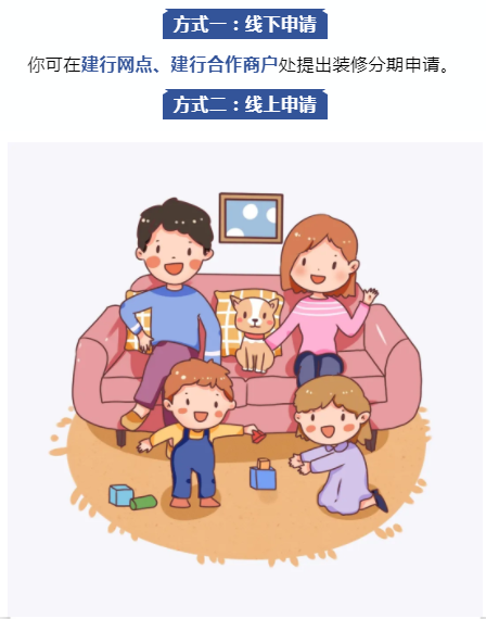 建行根据你的用款模式,发放装修分期额转至建行指定合作商户或你名下专用卡片